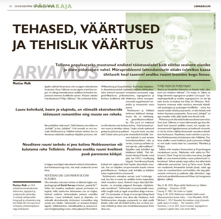 This was an article written in Estonian for Müürileht. The main topic was the increase in noise complaints in people living in and around popular places to spend time in Tallinn, like Telliskivi and Noblessner. These are both "culture factories" - former sites of manufacture appropriated by capital and culture.